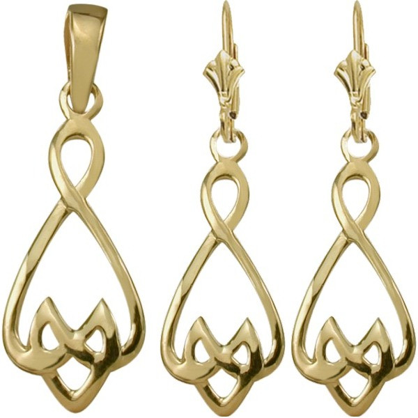 This celtic earrings and pendant set is crafted in 10 karat yellow gold. The pendant measures 10mm (0.4 inches) in width and 26.8mm (1.05 inches) in height and the earrings measure 10mm (0.4 inches) in width and 37mm (1.45 inches) in height. Available with your choice of a single pendant or a 16 inch, 18 inch or 20 inch chain.