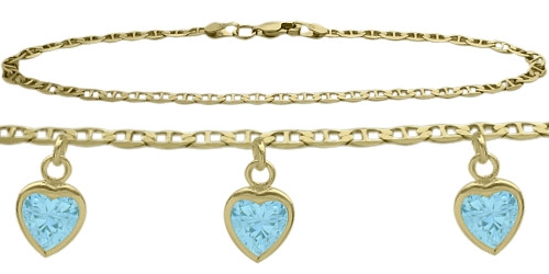 This elegant 10 karat yellow gold flat gucci style anklet measures 0.12 inches (3mm) in width. The 3 heart charms measure 6mm wide and 6mm in height. This anklet is available in your choice of 9 inches or 10 inches in length.
