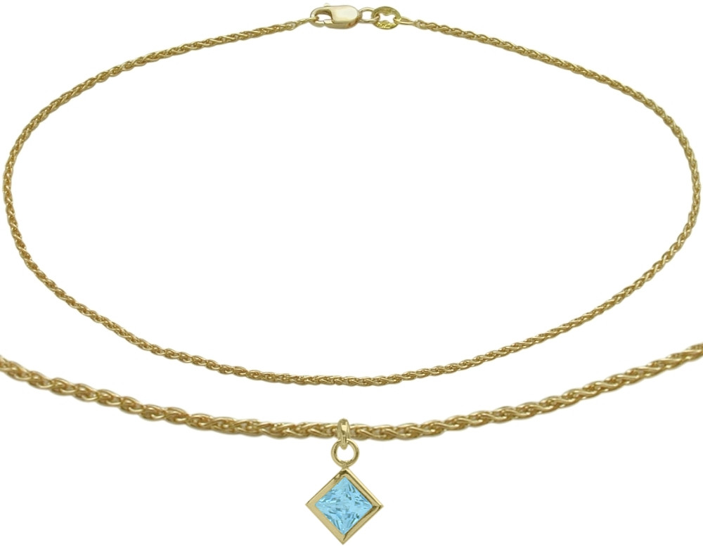 This elegant 10 karat yellow gold wheat style anklet measures 0.08 inches (2mm) in width. The square charm measures 5mm wide and 5mm high. This anklet is available in your choice of 9 inches or 10 inches in length.