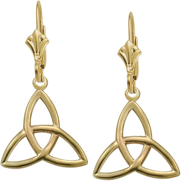 These high polish Trinity Knot leverback earrings are made of 10 karat yellow gold and measure 22mm or 0.9 inches in height and 20mm or 0.8 inches wide.