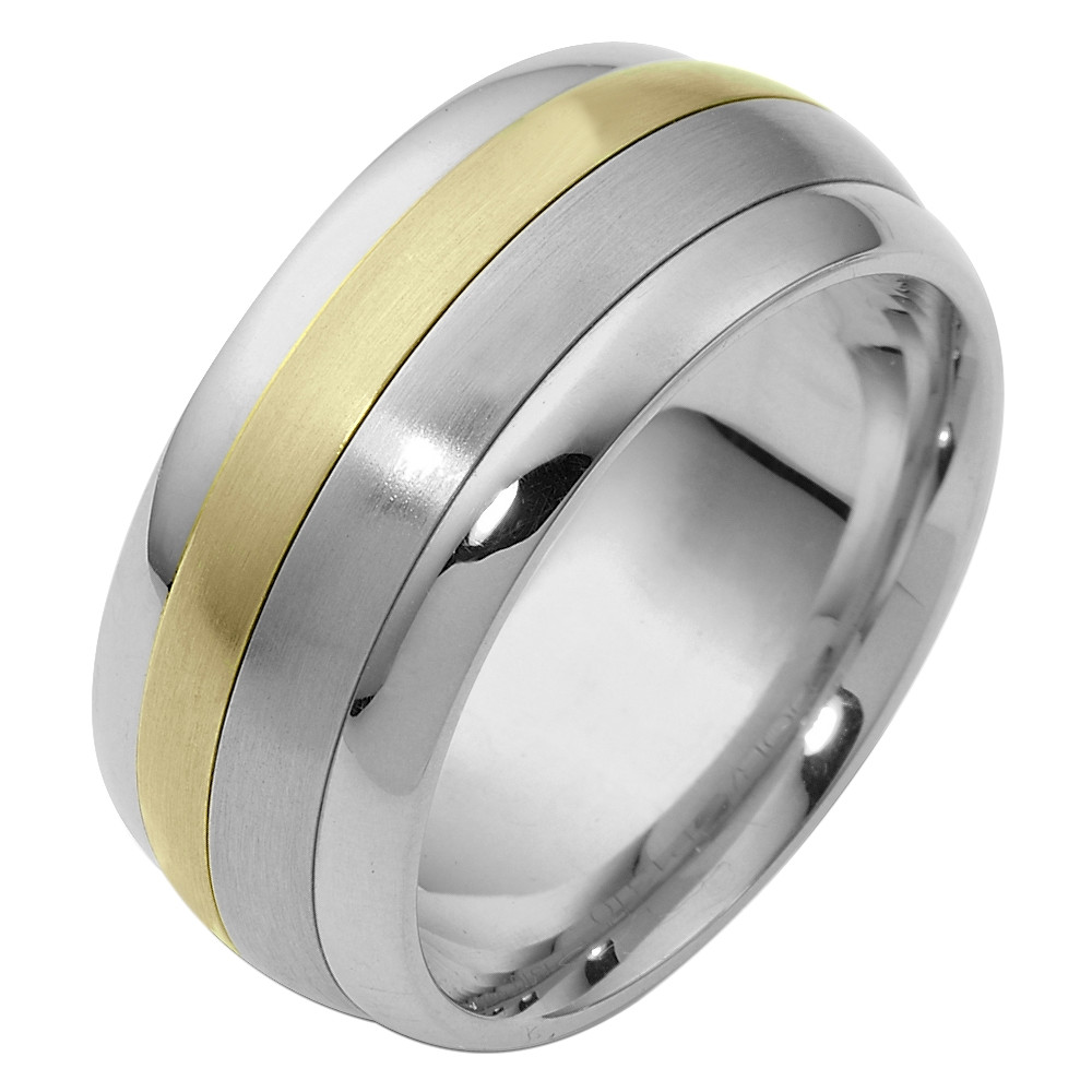 This designer two-tone gold SPINNING band is definitely a masterpiece. Measuring 9mm wide, this comfort fit band will definitely be the talk of the town. The ultimate in craftmanship and quality. NOTE: This wedding band is custom made to order.This ring is available in a variation of metals, colors & widths. Available metals include all gold types, platinum, palladium, titanium and steel. Please contact customer service with any questions, for a free ring sizer or any special order requests.