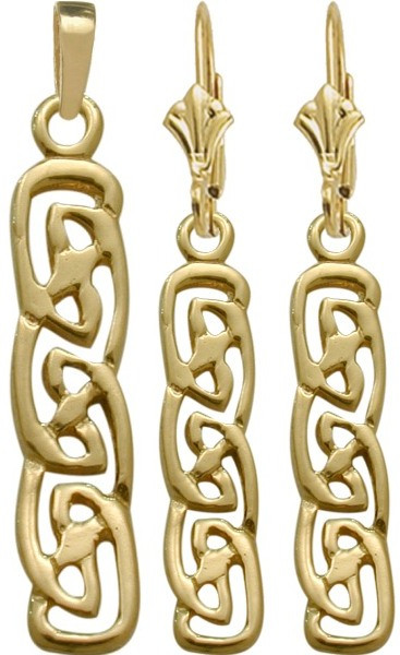 This celtic earrings and pendant set is crafted in 10 karat yellow gold. The pendant measures 6.1mm (0.25 inches) in width and 31.7mm (1.24 inches) in height and the earrings measure 6.1mm (0.25 inches) in width and 41.5mm (1.63 inches) in height. Available with your choice of a single pendant or a 16 inch, 18 inch or 20 inch chain.