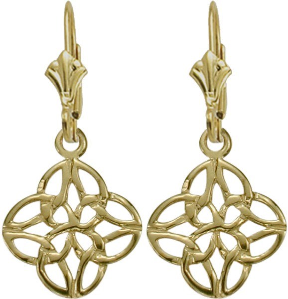 These high polish Celtic Knot leverback earrings are made of 10 karat yellow gold and measure 16mm or 0.64 inches in height and 13mm or 0.5 inches wide.