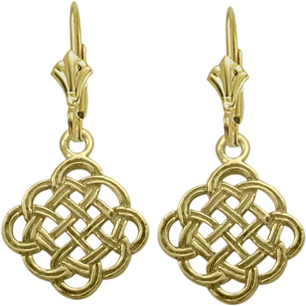 These high polish Celtic Knot leverback earrings are made of 10 karat yellow gold and measure 16.5mm or 0.7 inches in height and 13mm or 0.5 inches wide.