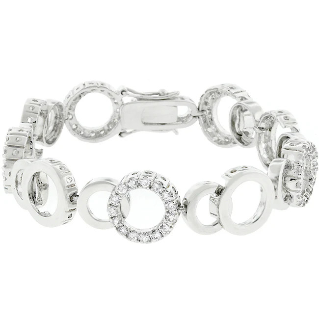 This contemporary rhodium plated cubic zirconia bracelet is set in a prong setting with a box clasp. Crafted of lead free alloy.