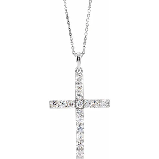 This beautiful small cubic zirconia cross is crafted of genuine sterling silver and measures 0.55 inches (13.85mm) wide and 1 inch (25.6mm) high. Choose between a 16 inch, 18 inch or 20 inch cable chain.