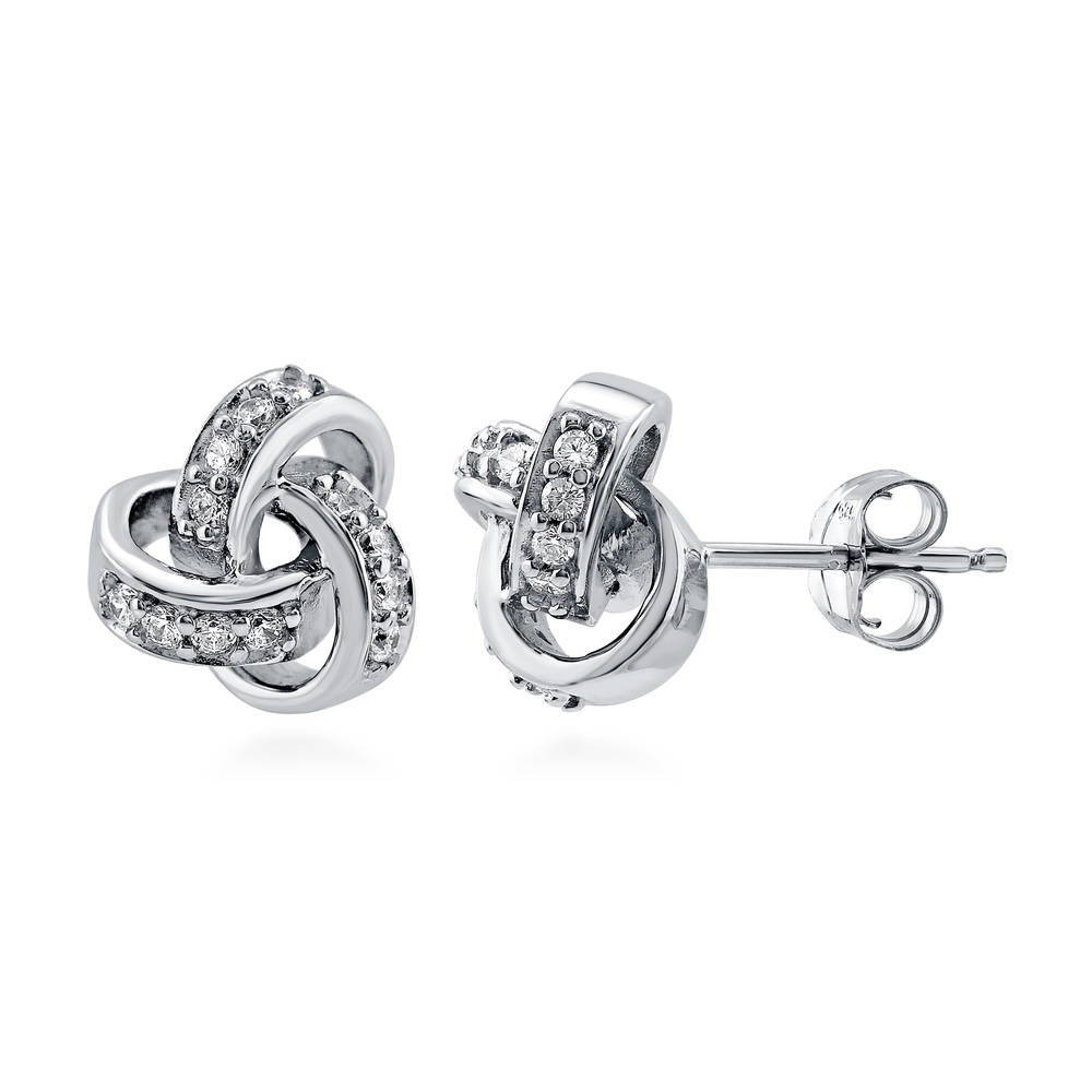 These love knot cubic zirconia stud earrings are crafted in genuine sterling silver. The earring diameter is 0.4 inches (10mm) high, the 30 stones measure 1.75mm and they come with sterling silver butterfly backings.