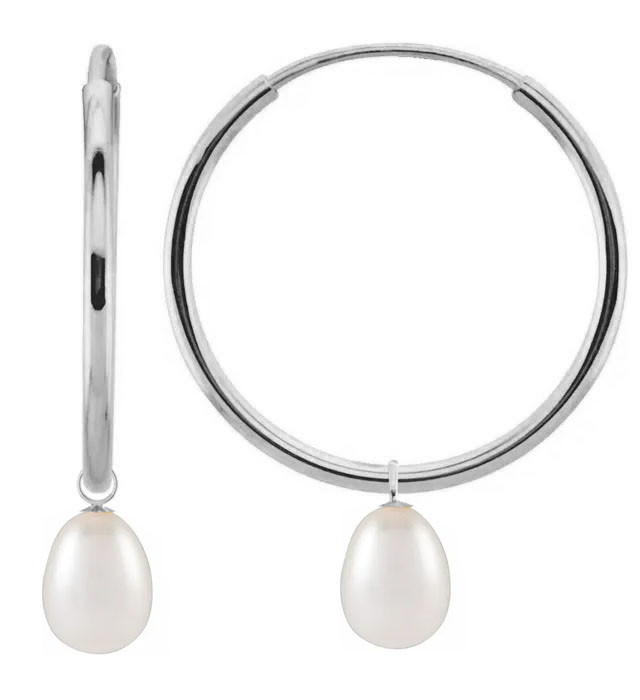 These high polish 10 karat white gold endless hoop earrings measure 19mm (0.75 inches) in diameter and 2mm (0.08 inches) in width, with a wire back closure. The white freshwater pearls measure 7mm x 6mm (sizes will vary slightly).