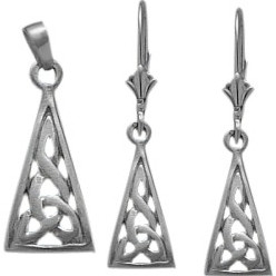 This Celtic earrings and pendant set is crafted in 10 karat white gold. The pendant measure 7.5mm or 0.3 inches in width and 22.3mm or 0.88 inches in height and the earrings measure 7.5mm or 0.3 inches in width and 32mm or 1.2 inches in height. Available with a 16 inch, 18 inch or 20 inch chain.
