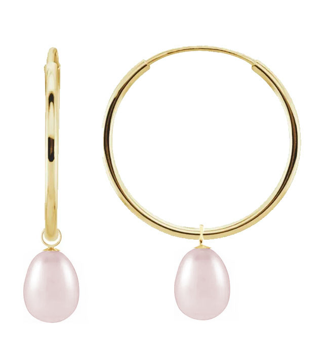These high polish 10 karat yellow gold endless hoop earrings measure 15mm (0.6 inches) in diameter 2mm (0.08 inches) in width, with a wire back closure. The pink freshwater pearls measure 7mm x 6mm (sizes will vary slightly).