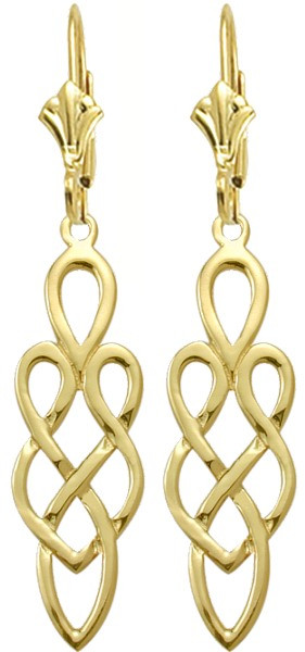 These high polish Celtic leverback earrings are made of 10 karat yellow gold and measure 24mm or 1 inch in height and 10mm or 0.4 inches wide.
