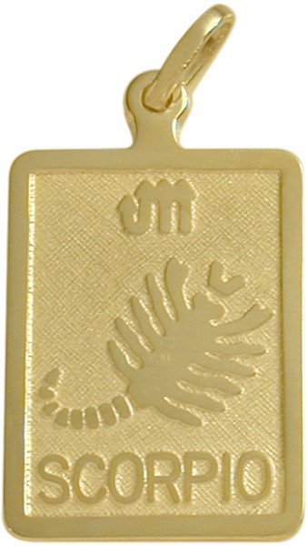 This beautiful high quality rectangular Scorpio pendant is crafted of 10 karat or 14 karat yellow gold. The pendant measures 15.5mm or 0.6 inches wide and 21.5mm or 0.85 inches high. Available as a single pendant or a pendant with a 16, inch, 18 inch or 20 inch chain.
