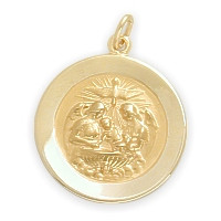 This beautiful 14-karat gold Baptismal medallion makes the perfect gift. The medallion illustrates a dove overlooking 2 angels holding a baby. The medallion measures 3/4 inches (18.5mm) in circumference. Engraving is also available on the back. Choose between a single pendant or a pendant with a 12", 14", 16" or 18" chain