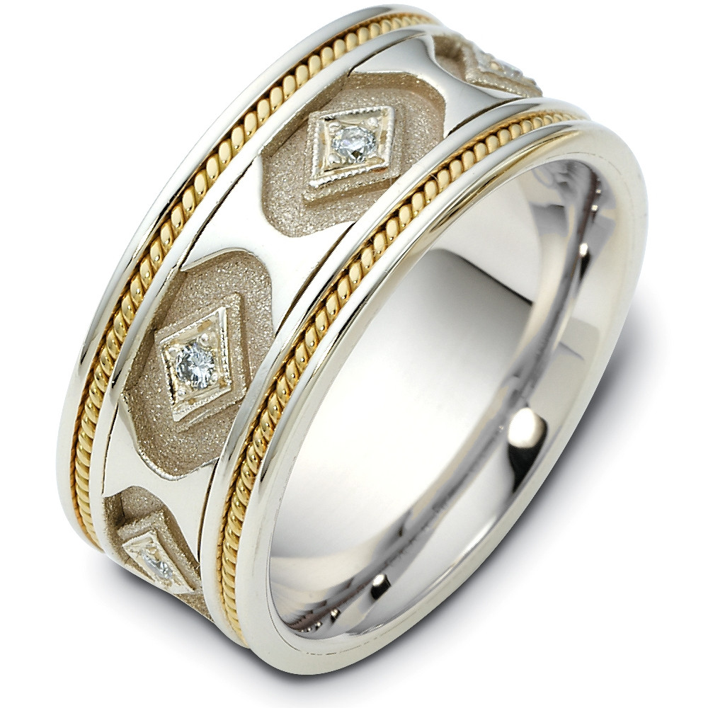 The designer two-tone gold band is definitely a masterpiece. 7 sparkling SI clarity, GH color round diamonds totaling 0.10 carats can be found throughout the band. Measuring 8.5mm wide, this comfort fit band will definitely be the talk of the town. The ultimate in craftmanship and quality. NOTE: This designer wedding band is custom made to order. Therefore please allow up to 2 weeks to manufacture before shipment. For rush shipments please contact customer service. This ring is also available in a variation of metals, colors & widths. Available metals include all gold types, platinum, palladium, titanium and steel. Please contact customer service with any questions, for a free ring sizer or any special order requests.