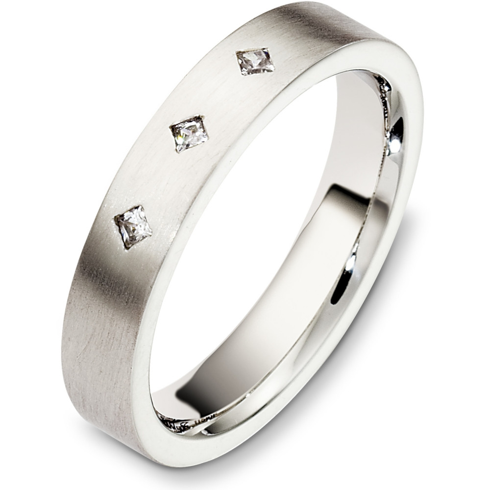 This designer white gold band is definitely a masterpiece. 3 sparkling SI clarity, GH color brilliant diamonds totaling 0.06 carats adorn the band. Measuring 4mm wide, this comfort fit band will definitely be the talk of the town. The ultimate in craftmanship and quality. NOTE: This wedding band is custom made to order. Therefore please allow 8-10 business days to manufacture before shipment. If you have any questions, comments or would like to receive a free ring sizer, please email customer service