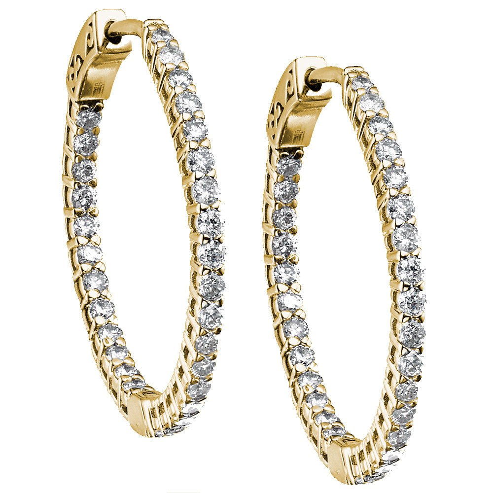 These 14 karat yellow gold 2 total carat weight diamond hoop earrings measure 1.15 inches (29mm) in height. The earrings boast SI2 - I1 clarity, GHI color diamonds to add a sense of luxury to any style.