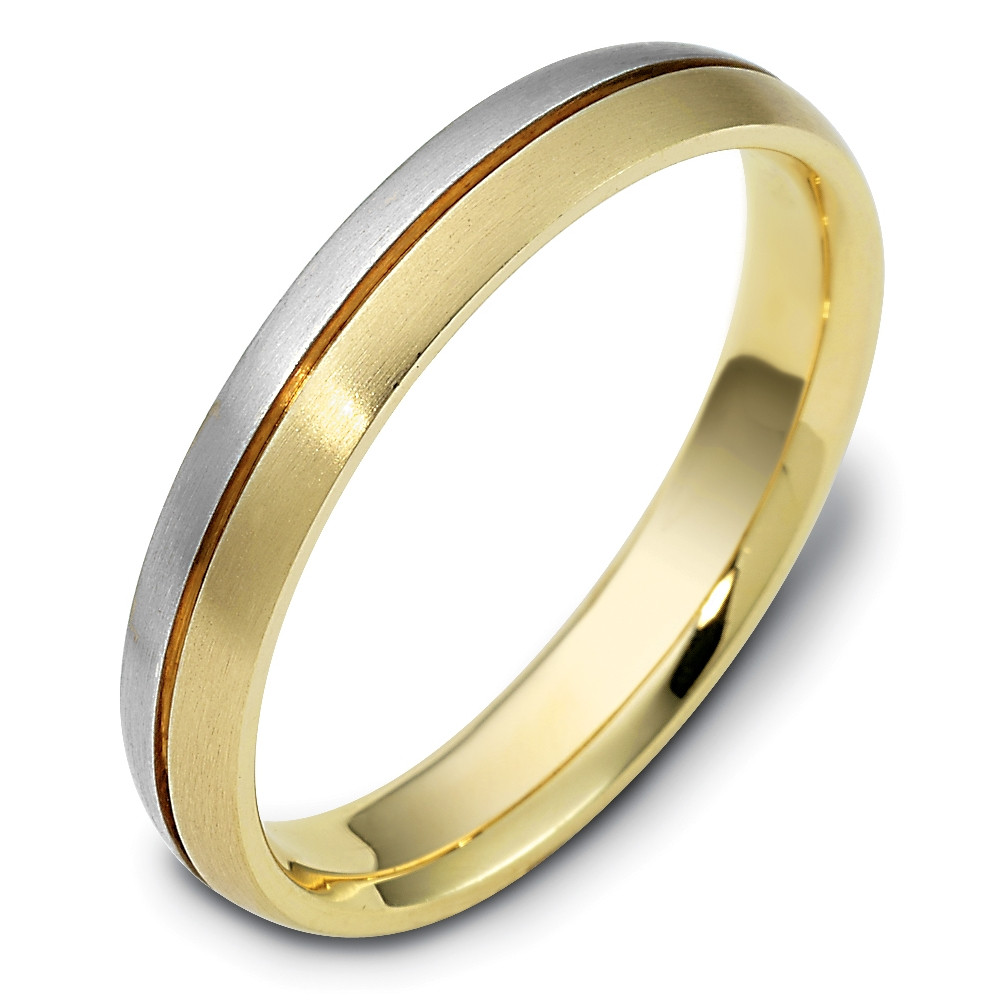 Enjoy the masterful smooth design of this beautifully detailed two-tone gold designer band. Measuring 4mm wide, this comfort fit band is the perfect blend of style and sophistication. The ultimate in craftmanship and quality. NOTE: This wedding band is custom made to order. Therefore please allow 8-10 business days to manufacture before shipment. This ring is also available in a variation of metals, colors & widths. Available metals include all gold types, platinum, palladium, titanium and steel. Please contact customer service with any questions, for a free ring sizer or any special order requests.