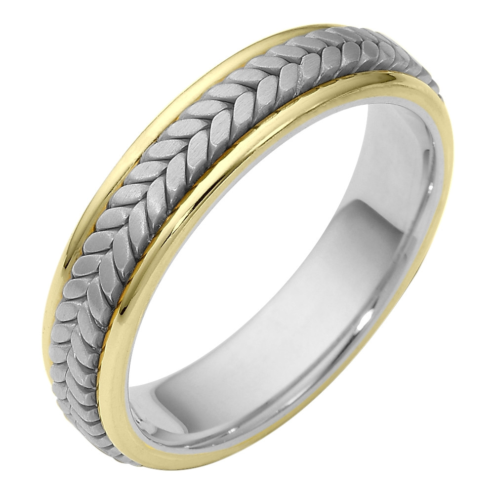 Enjoy the masterful smooth design of this beautifully detailed two-tone gold woven band. Measuring 5.5mm wide, this comfort fit band is the perfect blend of style and sophistication. The ultimate in craftmanship and quality. NOTE: This wedding band is custom made to order. Therefore please allow 8-10 business days to manufacture before shipment. This ring is available in a variation of metals, colors & widths. Available metals include all gold types, platinum, palladium, titanium and steel. Please contact customer service with any questions, for a free ring sizer or any special order requests.