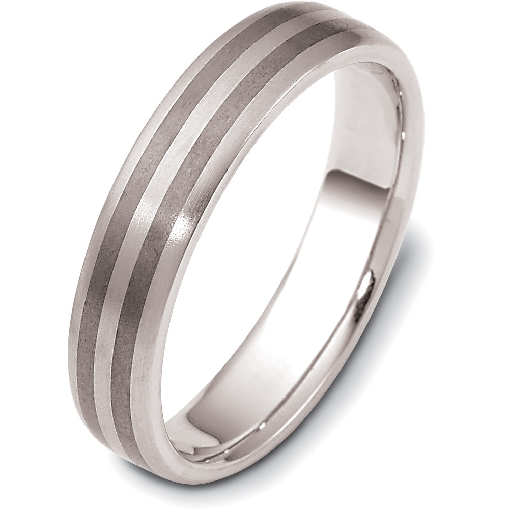 Enjoy the simple but stylish appeal of this titanium & white gold wedding band. Measuring 5mm wide, this comfort fit wedding band is definitely an eye catcher. The ultimate in craftmanship and quality. NOTE: This wedding band is custom made to order. Therefore please allow 8-10 business days to manufacture before shipment. This ring is also available in a variation of metals, colors & widths.