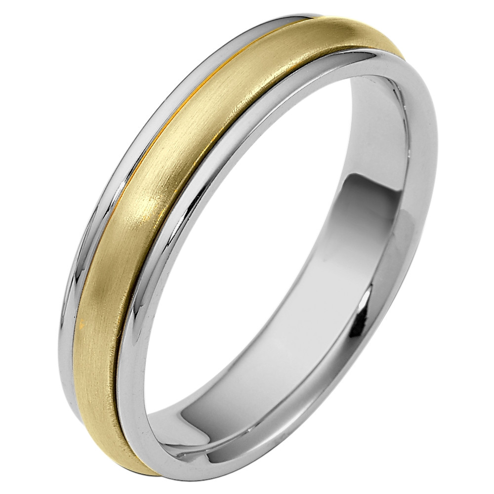 Enjoy the masterful smooth design of this beautifully detailed two-tone gold designer band. Measuring 5mm wide, this comfort fit band is the perfect blend of style and sophistication. The ultimate in craftmanship and quality. NOTE: This wedding band is custom made to order. This ring is also available in a variation of metals, colors & widths. Available metals include all gold types, platinum, palladium, titanium and steel. Please contact customer service with any questions, for a free ring sizer or any special order requests.