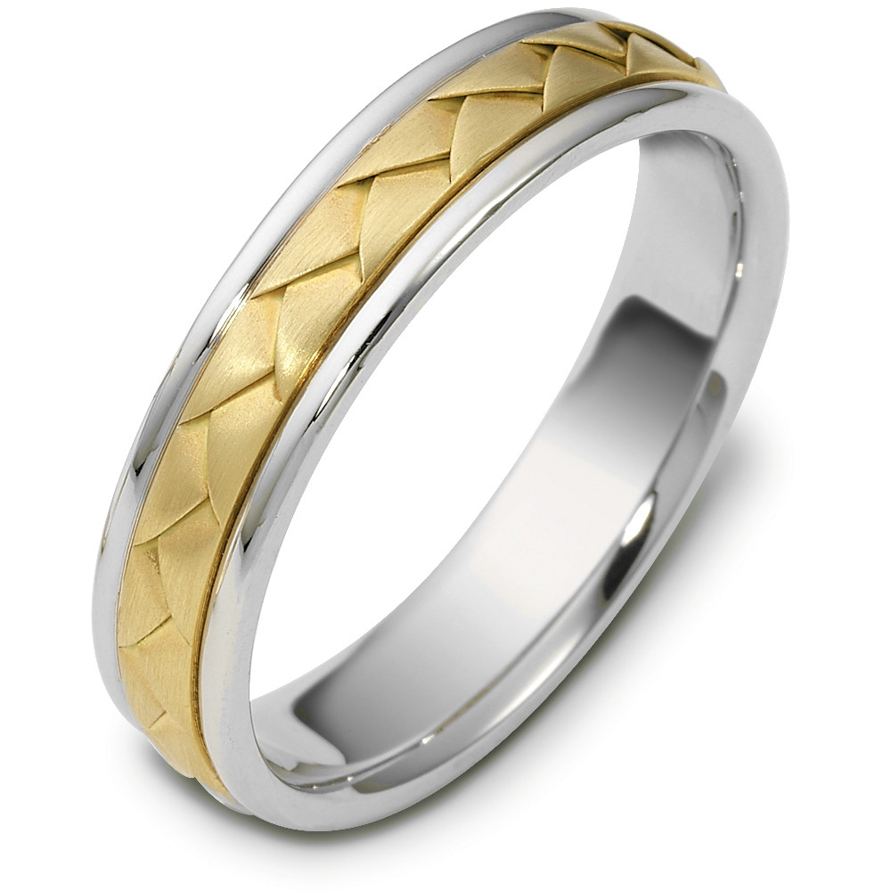 Enjoy the masterful smooth design of this beautifully detailed two-tone gold woven band. Measuring 5mm wide, this comfort fit band is the perfect blend of style and sophistication. The ultimate in craftmanship and quality. NOTE: This wedding band is custom made to order. Therefore please allow 8-10 business days to manufacture before shipment. This ring is available in a variation of metals, colors & widths. Available metals include all gold types, platinum, palladium, titanium and steel. Please contact customer service with any questions, for a free ring sizer or any special order requests.