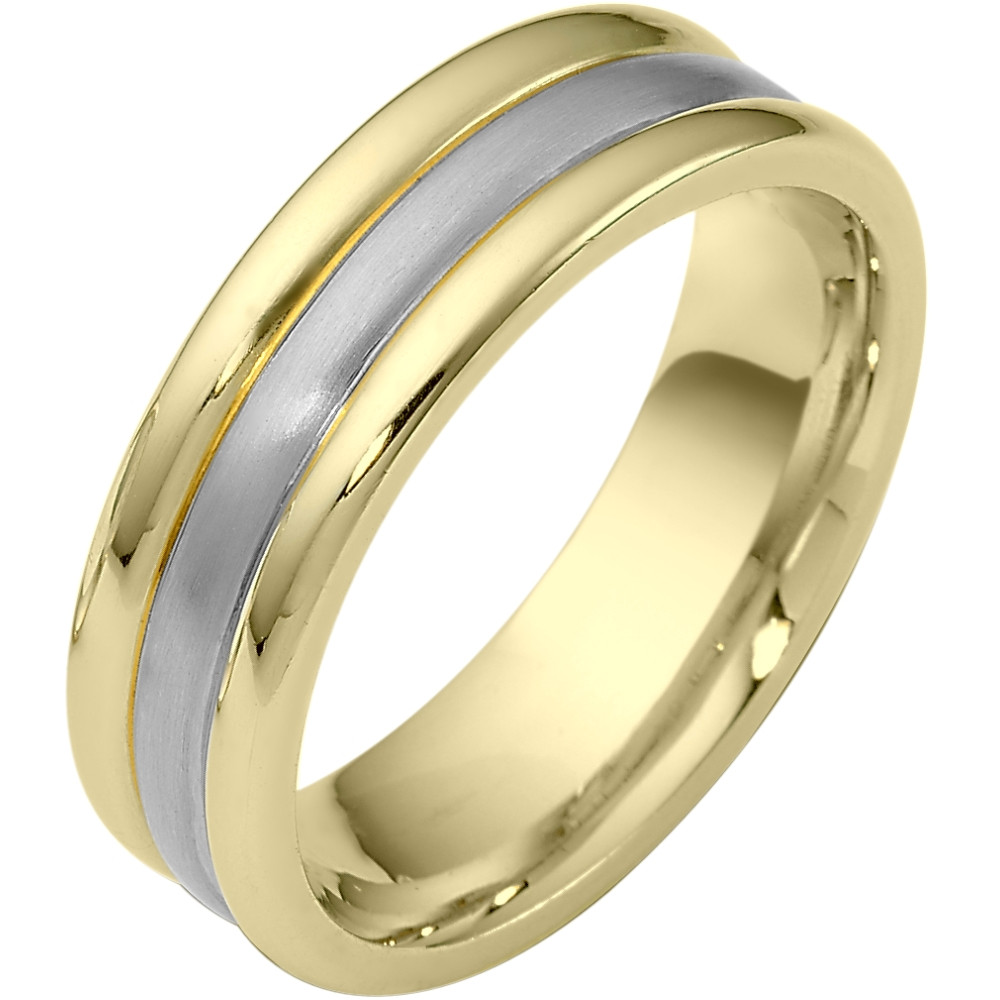 Enjoy the masterful smooth design of this beautifully detailed two-tone gold designer band. Measuring 7mm wide, this comfort fit band is the perfect blend of style and sophistication. The ultimate in craftmanship and quality. NOTE: This wedding band is custom made to order. This ring is also available in a variation of metals, colors & widths. Available metals include all gold types, platinum, palladium, titanium and steel. Please contact customer service with any questions, for a free ring sizer or any special order requests.
