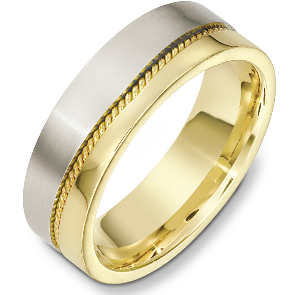 Enjoy the masterful smooth design of this beautifully detailed two-tone gold band. Measuring 7mm wide, this comfort fit band is the perfect blend of style and sophistication. The ultimate in craftmanship and quality. NOTE: This wedding band is custom made to order. Therefore please allow 8-10 business days to manufacture before shipment. This ring is available in a variation of metals, colors & widths. Available metals include all gold types, platinum, palladium, titanium and steel. Please contact customer service with any questions, for a free ring sizer or any special order requests.