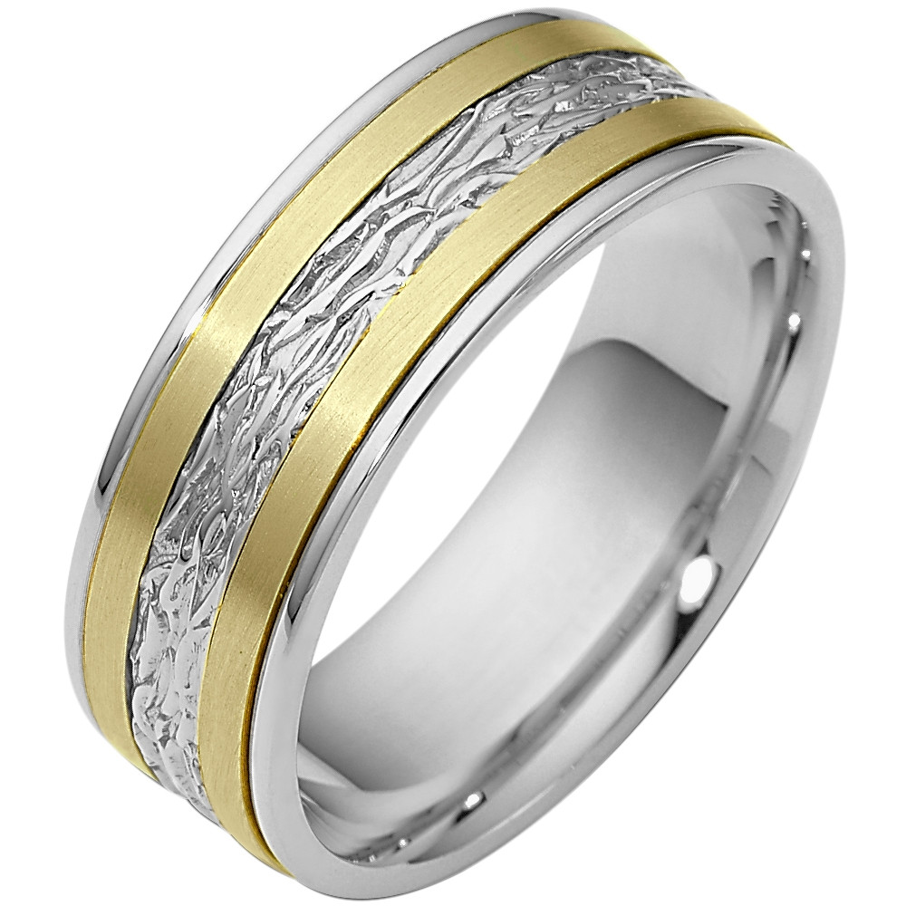 Enjoy the masterful smooth design of this beautifully detailed two-tone gold woven band. Measuring 7mm wide, this comfort fit band is the perfect blend of style and sophistication. The ultimate in craftmanship and quality. NOTE: This wedding band is custom made to order. Therefore please allow 8-10 business days to manufacture before shipment. This ring is available in a variation of metals, colors & widths. Available metals include all gold types, platinum, palladium, titanium and steel. Please contact customer service with any questions, for a free ring sizer or any special order requests.