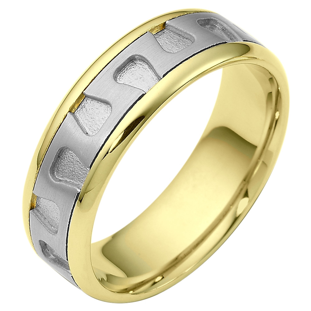 Enjoy the masterful smooth design of this beautifully detailed two-tone gold designer band. Measuring 7mm wide, this comfort fit band is the perfect blend of style and sophistication. The ultimate in craftmanship and quality. NOTE: This wedding band is custom made to order. Therefore please allow 8-10 business days to manufacture before shipment.This ring is also available in a variation of metals, colors & widths. Available metals include all gold types, platinum, palladium, titanium and steel. Please contact customer service with any questions, for a free ring sizer or any special order requests.