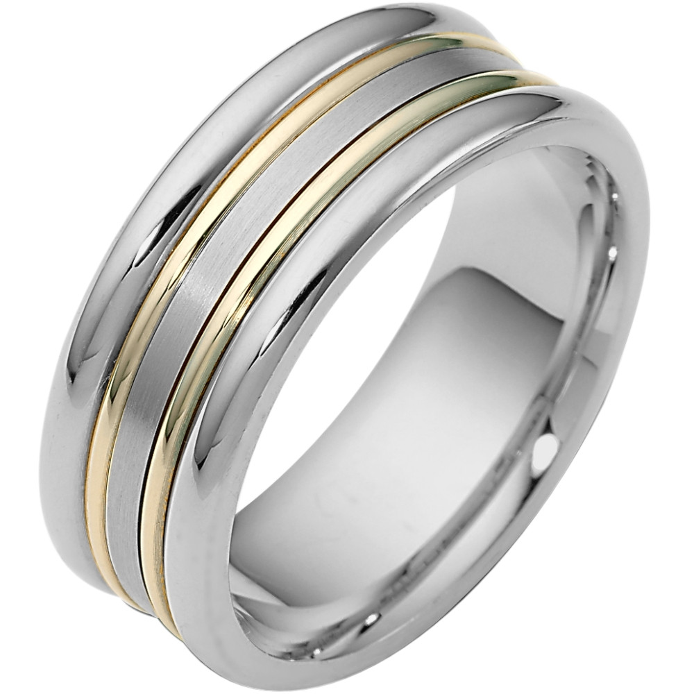 Enjoy the masterful smooth design of this beautifully detailed two-tone gold designer band. Measuring 8mm wide, this comfort fit band is the perfect blend of style and sophistication. The ultimate in craftmanship and quality. NOTE: This wedding band is custom made to order. This ring is also available in a variation of metals, colors & widths. Available metals include all gold types, platinum, palladium, titanium and steel. Please contact customer service with any questions, for a free ring sizer or any special order requests.