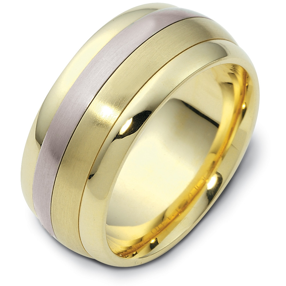 This designer two-tone gold SPINNING band is definitely a masterpiece. Measuring 9mm wide, this comfort fit band will definitely be the talk of the town. The ultimate in craftmanship and quality. NOTE: This wedding band is custom made to order.This ring is available in a variation of metals, colors & widths. Available metals include all gold types, platinum, palladium, titanium and steel. Please contact customer service with any questions, for a free ring sizer or any special order requests.