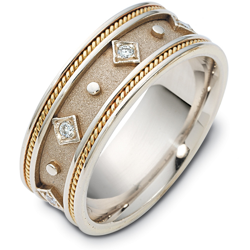 This exquisite diamond Etruscan wedding band contains 0.15 total weight SI clarity, GH color diamonds. This 8.5mm comfort fit wedding band is the perfect blend of style and texture. The ultimate in craftmanship and quality. NOTE: This designer wedding band is custom made to order. Therefore please allow up to 2 weeks to manufacture before shipment. For rush shipments please contact customer service. This ring is also available in a variation of metals, colors & widths. Available metals include all gold types, platinum, palladium, titanium and steel. Please contact customer service with any questions, for a free ring sizer or any special order requests.