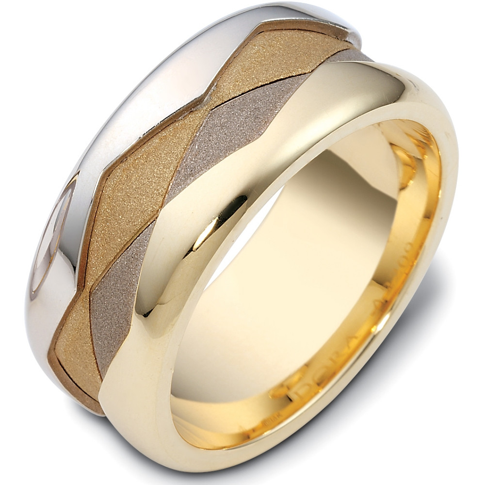 Enjoy the beautiful waves and contrasting texture of this two-tone wedding band. Measuring 9mm wide, this comfort fit wedding band is definitely an eye catcher. The ultimate in craftmanship and quality. NOTE: This designer wedding band is custom made to order. Therefore please allow up to 2 weeks to manufacture before shipment. For rush shipments please contact customer service. This ring is also available in a variation of metals, colors & widths. Available metals include all gold types, platinum, palladium, titanium and steel. Please contact customer service with any questions, for a free ring sizer or any special order requests.