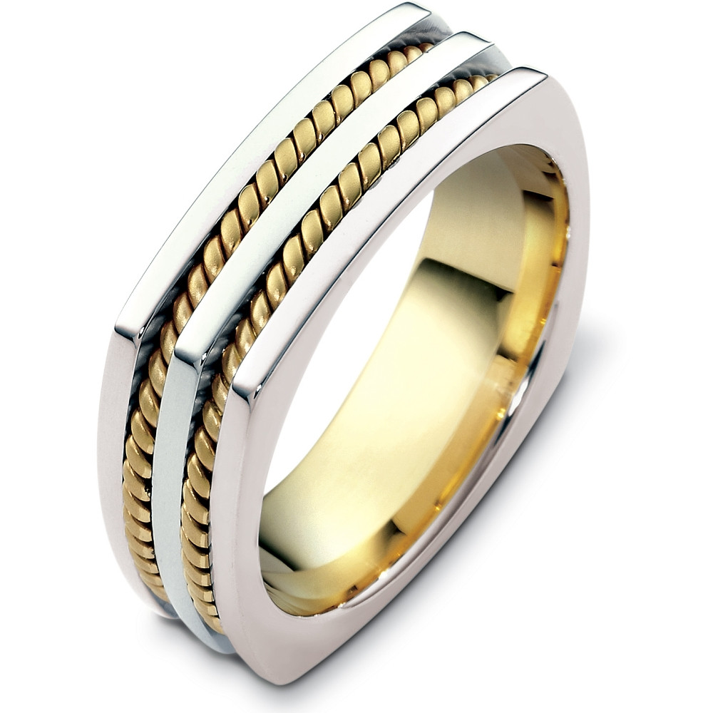 Enjoy the exquisite design of this beautifully detailed two-tone rope style squarish band. Measuring 7mm wide, this comfort fit band is definitely an eye catcher. The ultimate in craftmanship and quality. NOTE: This designer wedding band is custom made to order. Therefore please allow up to 2 weeks to manufacture before shipment. For rush shipments please contact customer service. This ring is also available in a variation of metals, colors & widths. Available metals include all gold types, platinum, palladium, titanium and steel. Please contact customer service with any questions, for a free ring sizer or any special order requests.