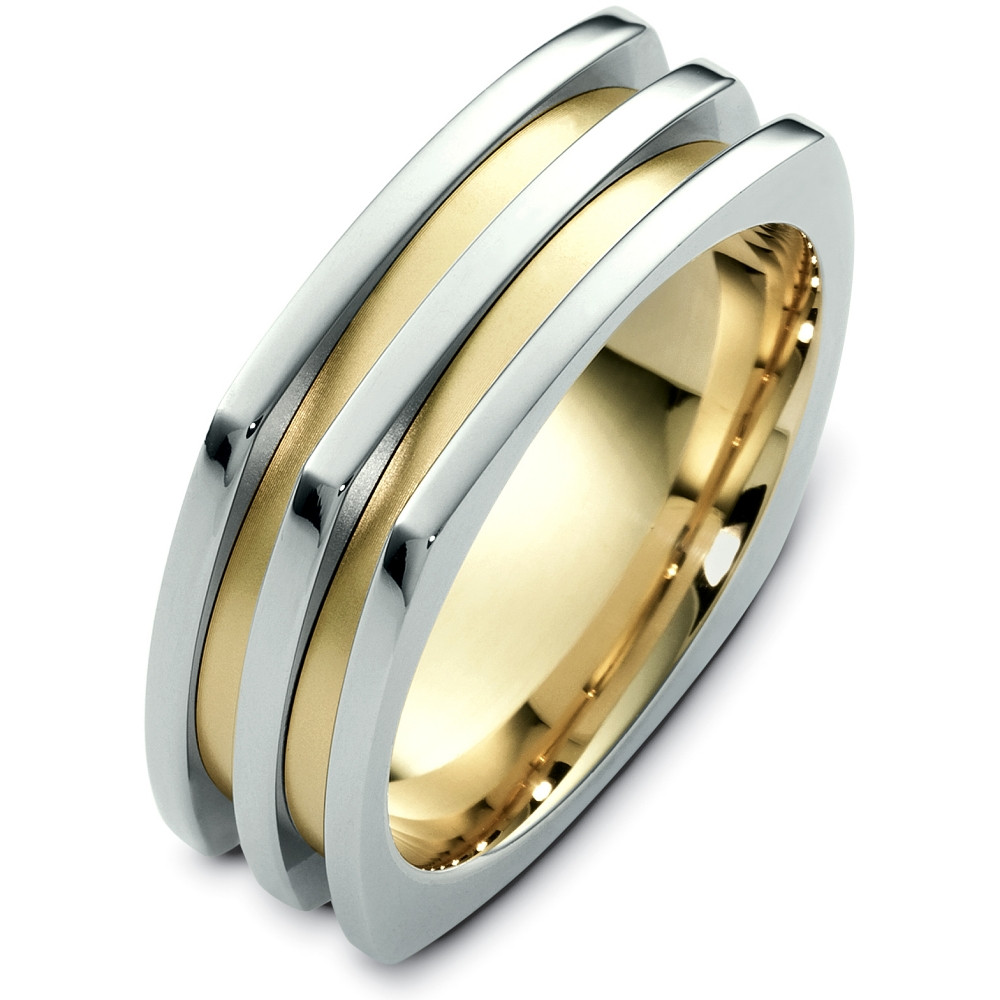 Enjoy the exquisite design of this beautifully detailed two-tone squarish band. Measuring 8.5mm wide, this comfort fit band is definitely an eye catcher. The ultimate in craftmanship and quality. NOTE: This designer wedding band is custom made to order. Therefore please allow up to 2 weeks to manufacture before shipment. For rush shipments please contact customer service. This ring is also available in a variation of metals, colors & widths. Available metals include all gold types, platinum, palladium, titanium and steel. Please contact customer service with any questions, for a free ring sizer or any special order requests.