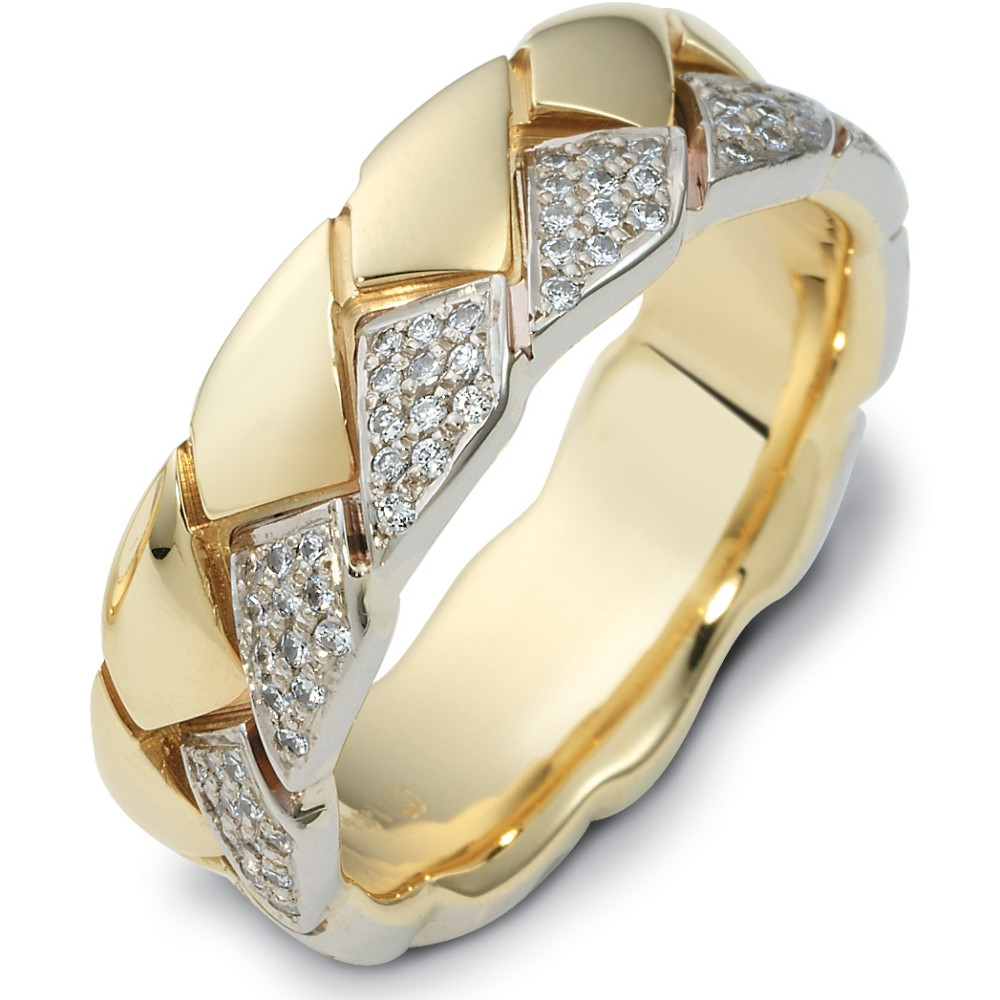 The designer two-tone gold band is definitely a masterpiece. 120 sparkling SI clarity, GH color round diamonds totaling 0.6 carats can be found throughout the band. Measuring 7.5mm wide, this comfort fit band will definitely be the talk of the town. The ultimate in craftmanship and quality. NOTE: This designer wedding band is custom made to order. Therefore please allow up to 2 weeks to manufacture before shipment. For rush shipments please contact customer service. This ring is also available in a variation of metals, colors & widths. Available metals include all gold types, platinum, palladium, titanium and steel. Please contact customer service with any questions, for a free ring sizer or any special order requests.