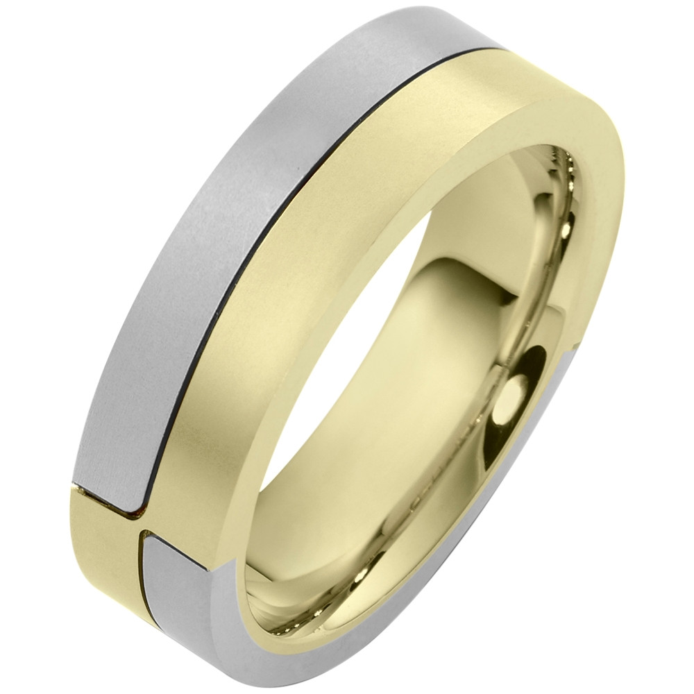 Enjoy the masterful smooth design of this beautifully detailed two-tone gold designer band. Measuring 6mm wide, this comfort fit band is the perfect blend of style and sophistication. The ultimate in craftmanship and quality. NOTE: This wedding band is custom made to order. Therefore please allow 5-7 business days to manufacture before shipment.This ring is also available in a variation of metals, colors & widths. Available metals include all gold types, platinum, palladium, titanium and steel. Please contact customer service with any questions, for a free ring sizer or any special order requests.