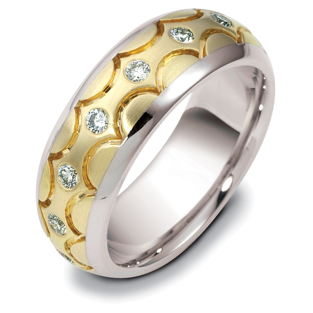 This designer two-tone gold band is definitely a masterpiece. 14 sparkling SI clarity, GH color round brilliant diamonds totaling 0.49 carats adorn the band. Measuring 7mm wide, this comfort fit band will definitely be the talk of the town. The ultimate in craftmanship and quality. NOTE: This designer wedding band is custom made to order. Therefore please allow up to 2 weeks to manufacture before shipment. For rush shipments please contact customer service. This ring is also available in a variation of metals, colors & widths. Available metals include all gold types, platinum, palladium, titanium and steel. Please contact customer service with any questions, for a free ring sizer or any special order requests.