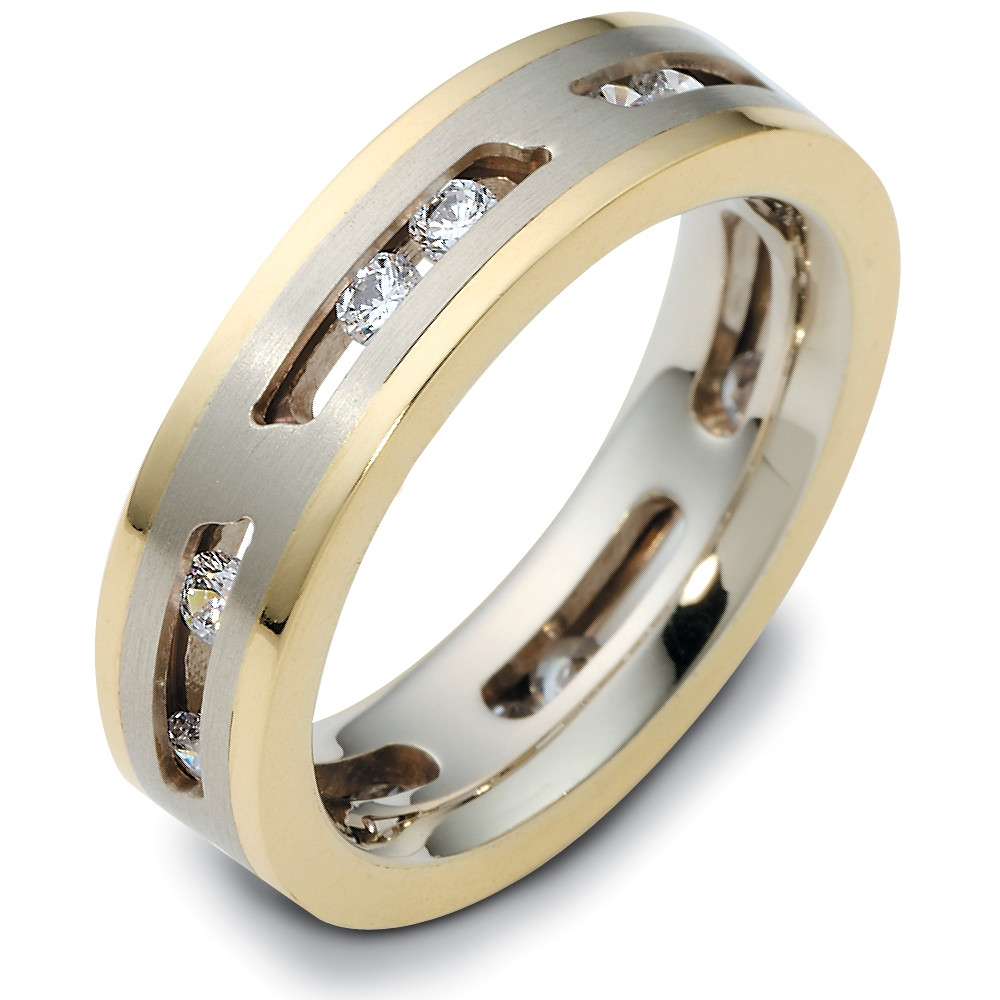 This beautiful 5.5mm wide two-tone gold band features 12 channel set diamonds around the band. The diamonds amazingly move within their channels. The diamonds are of SI clarity, GH color with a 0.54 total carat weight. The ultimate in craftmanship and quality. NOTE: This designer wedding band is custom made to order. Therefore please allow up to 2 weeks to manufacture before shipment. For rush shipments please contact customer service. This ring is also available in a variation of metals, colors & widths. Available metals include all gold types, platinum, palladium, titanium and steel. Please contact customer service with any questions, for a free ring sizer or any special order requests.
