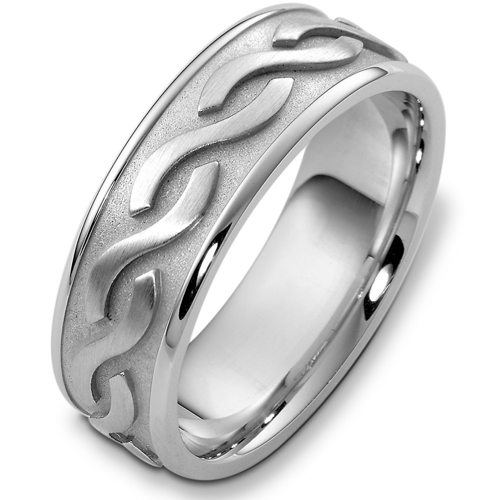 Enjoy the exquisite design of this beautifully detailed wave style high polish and satin finish band. Measuring 7.5mm wide, this band is definitely an eye catcher. The ultimate in craftmanship and quality. NOTE: This designer wedding band is custom made to order. Therefore please allow up to 2 weeks to manufacture before shipment. For rush shipments please contact customer service. This ring is also available in a variation of metals, colors & widths. Available metals include all gold types, platinum, palladium, titanium and steel. Please contact customer service with any questions, for a free ring sizer or any special order requests.