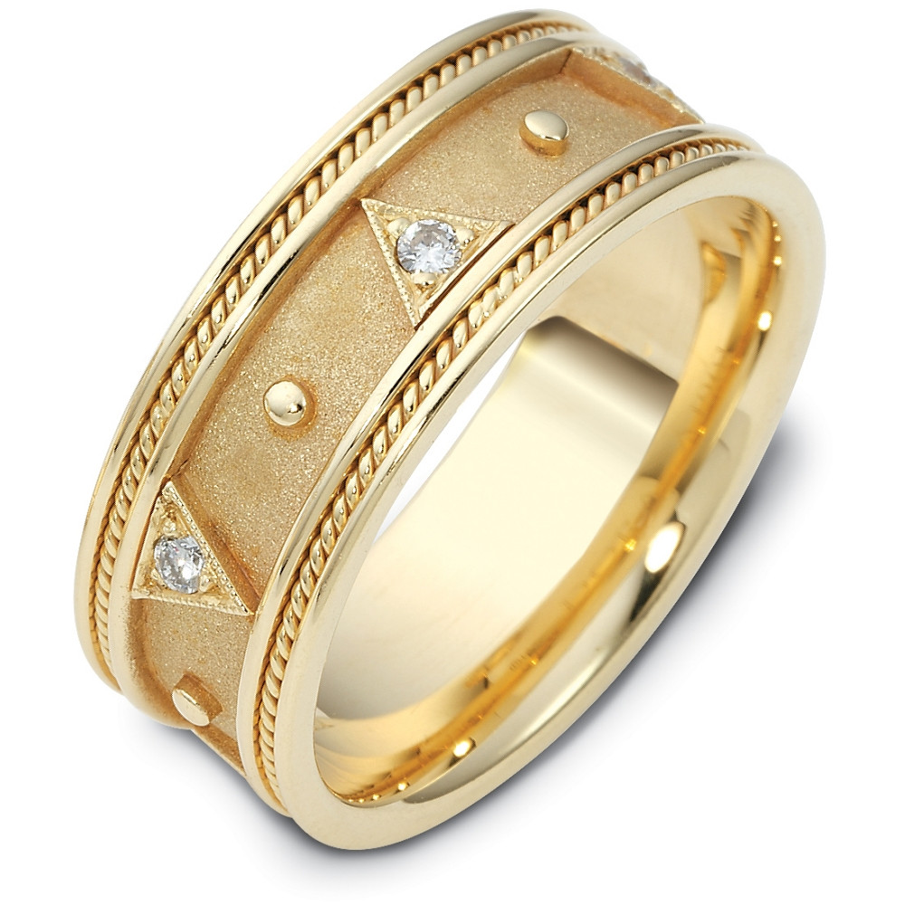 This exquisite diamond Etruscan wedding band contains 0.15 total weight SI clarity, GH color diamonds. This 8.5mm comfort fit wedding band is the perfect blend of style and texture. The ultimate in craftmanship and quality. NOTE: This designer wedding band is custom made to order. Therefore please allow up to 2 weeks to manufacture before shipment. For rush shipments please contact customer service. This ring is also available in a variation of metals, colors & widths. Available metals include all gold types, platinum, palladium, titanium and steel. Please contact customer service with any questions, for a free ring sizer or any special order requests.