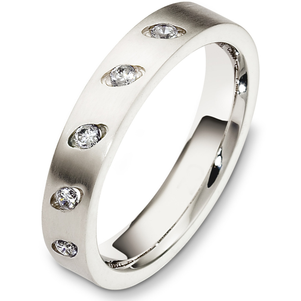 This designer white gold band is definitely a masterpiece. 5 sparkling SI clarity, GH color brilliant diamonds totaling 0.20 carats adorn the band. Measuring 4mm wide, this comfort fit band will definitely be the talk of the town. The ultimate in craftmanship and quality. NOTE: This wedding band is custom made to order. Therefore please allow 8-10 business days to manufacture before shipment. If you have any questions, comments or would like to receive a free ring sizer, please email customer service
