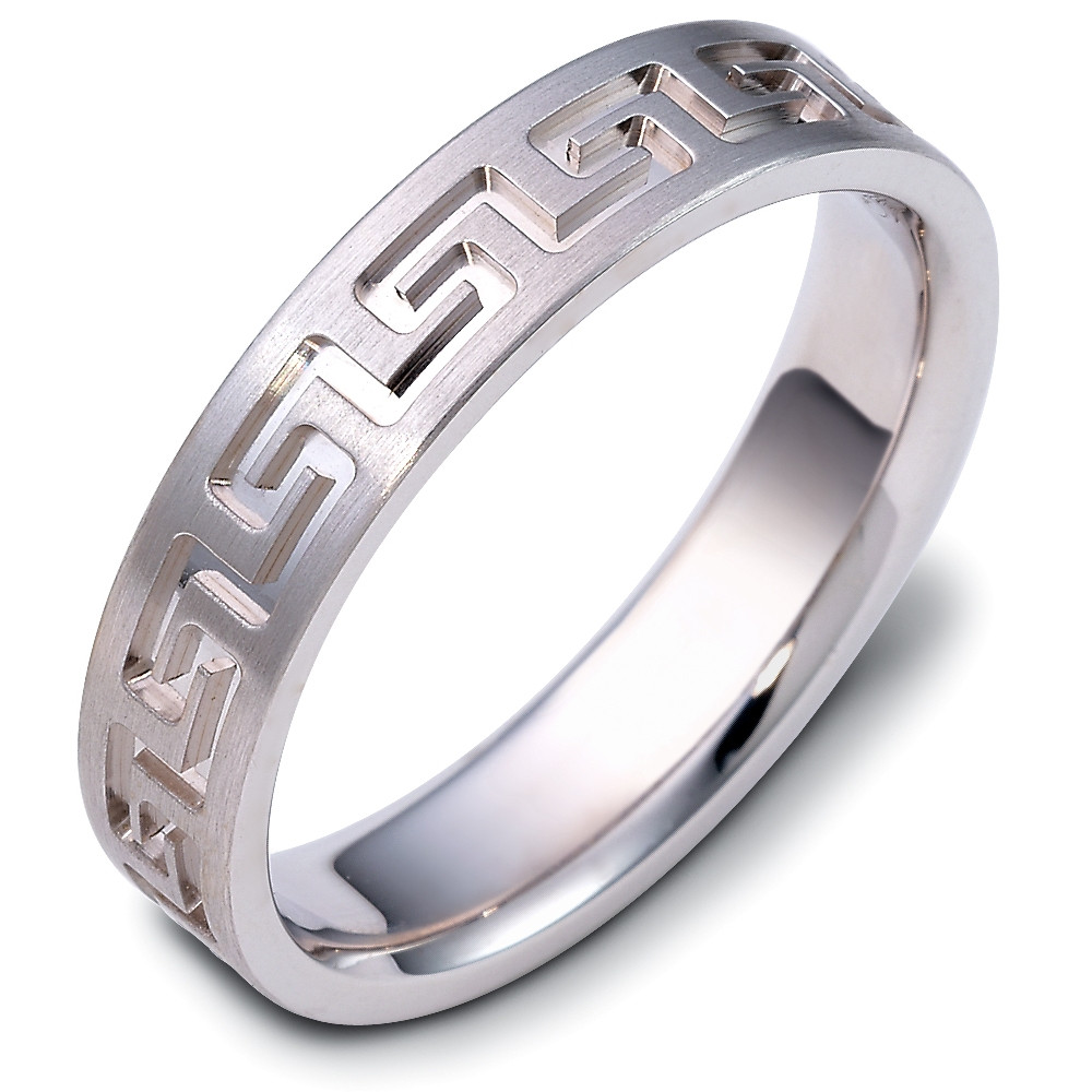 Enjoy the Greek key design often used to symbolize eternal love. Measuring 5mm wide, this comfort fit band is the perfect blend of style and tradition. The ultimate in craftmanship and quality. NOTE: This designer wedding band is custom made to order. Therefore please allow up to 2 weeks to manufacture before shipment. For rush shipments please contact customer service. This ring is also available in a variation of metals, colors & widths. Available metals include all gold types, platinum, palladium, titanium and steel. Please contact customer service with any questions, for a free ring sizer or any special order requests.