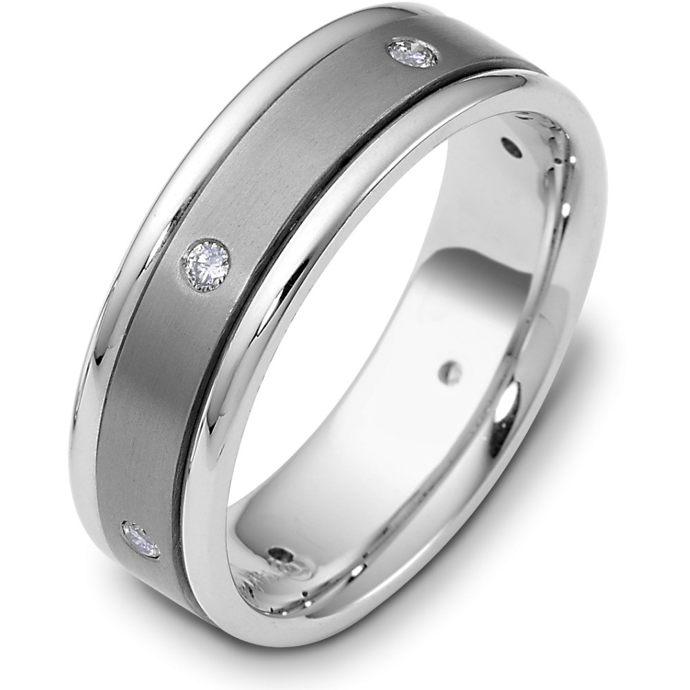 This designer titanium and white gold band is definitely a masterpiece. 6 sparkling SI clarity, GH color round brilliant diamonds totaling 0.09 carats adorn the band. Measuring 9mm wide, this comfort fit band will definitely be the talk of the town. Available with your choice of 14 karat or 18 karat gold. The ultimate in craftmanship and quality. NOTE: This wedding band is custom made to order. Therefore please allow 8-10 business days to manufacture before shipment. This ring is available in a variation of metals, colors & widths. Available metals include all gold types, platinum, palladium, titanium and steel. Please contact customer service with any questions, for a free ring sizer or any special order requests.