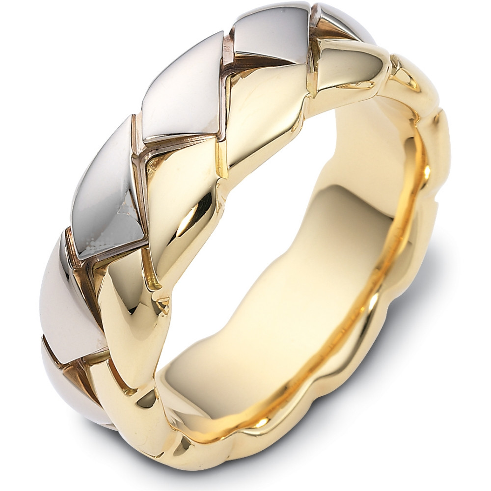 Enjoy the exquisite design of this beautifully detailed high polish two-tone wedding band. Measuring 8mm wide, this comfort fit wedding band is definitely an eye catcher. The ultimate in craftmanship and quality. NOTE: This designer wedding band is custom made to order. Therefore please allow up to 2 weeks to manufacture before shipment. For rush shipments please contact customer service. This ring is also available in a variation of metals, colors & widths. Available metals include all gold types, platinum, palladium, titanium and steel. Please contact customer service with any questions, for a free ring sizer or any special order requests.