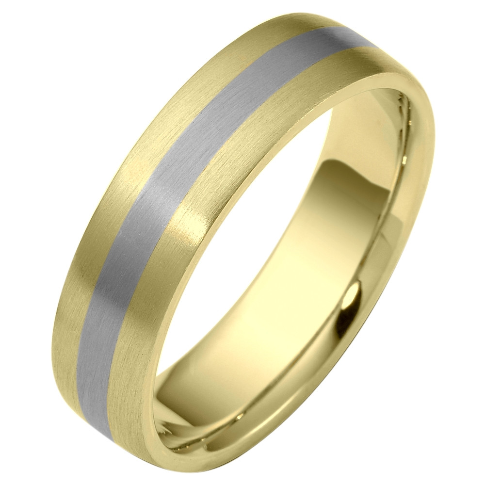 Enjoy the masterful smooth design of this beautifully detailed two-tone gold designer band. Measuring 6mm wide, this comfort fit band is the perfect blend of style and sophistication. The ultimate in craftmanship and quality. NOTE: This wedding band is custom made to order. This ring is also available in a variation of metals, colors & widths. Available metals include all gold types, platinum, palladium, titanium and steel. Please contact customer service with any questions, for a free ring sizer or any special order requests.