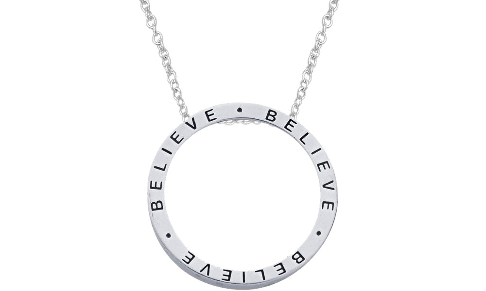 This circle slide "BELIEVE" pendant is crafted in genuine sterling silver. This circle measures 26mm (1.02 inches) in diameter and the chain holes measure 1.8mm (0.074 Inches) x 3.3mm (0.137 Inches). Available with your choice of a 16 inch, 18 inch, 20 inch, 22 inch or 24 inch cable chain.