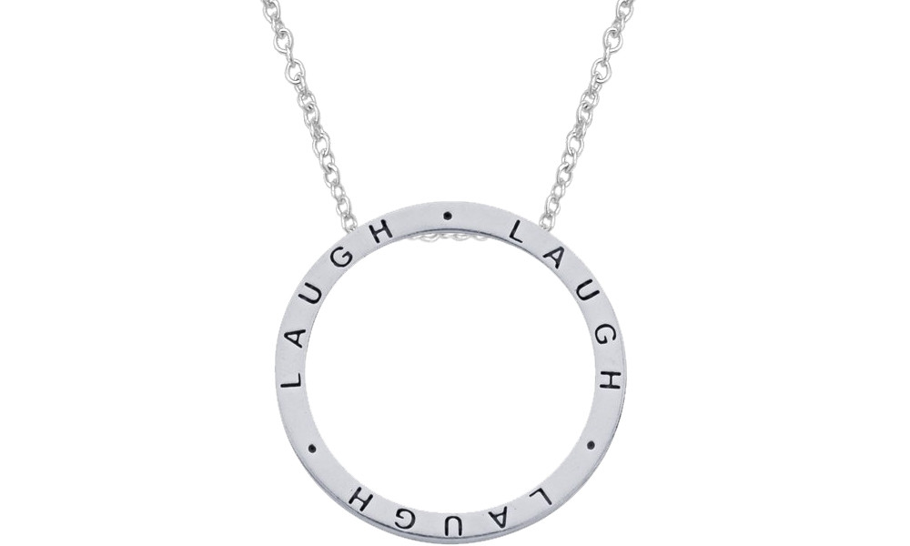 This circle slide "LAUGH" pendant is crafted in genuine sterling silver. This circle measures 26mm (1.02 inches) in diameter and the chain holes measure 1.8mm (0.074 Inches) x 3.3mm (0.137 Inches). Available with your choice of a 16 inch, 18 inch, 20 inch, 22 inch or 24 inch cable chain.