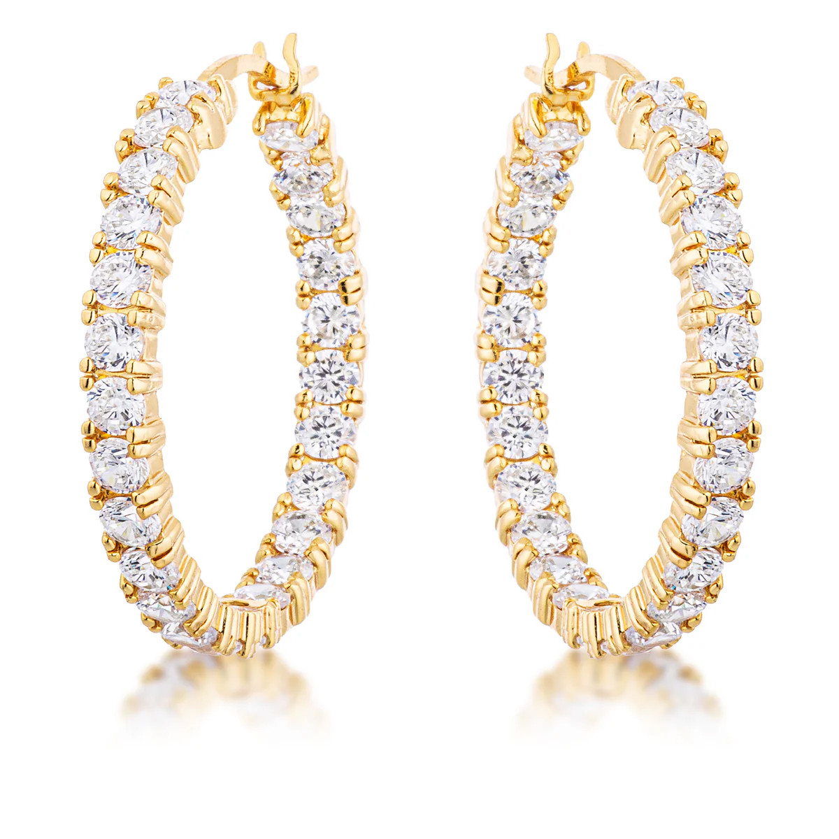 These gold plated hoop earrings are crafted of base metal. The earrings measure 33mm (1.3 Inches) high and have 4mm cubic zirconia stones in prong settings. They also have a hinge with notched post closure.