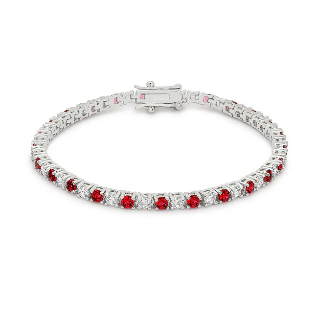 White Gold Rhodium Bonded 7 Inch Tennis Bracelet with Round Cut Created Rubies and Clear Cubic Zirconias in a Prong Setting with a Box Clasp. Crafted of lead free alloy.